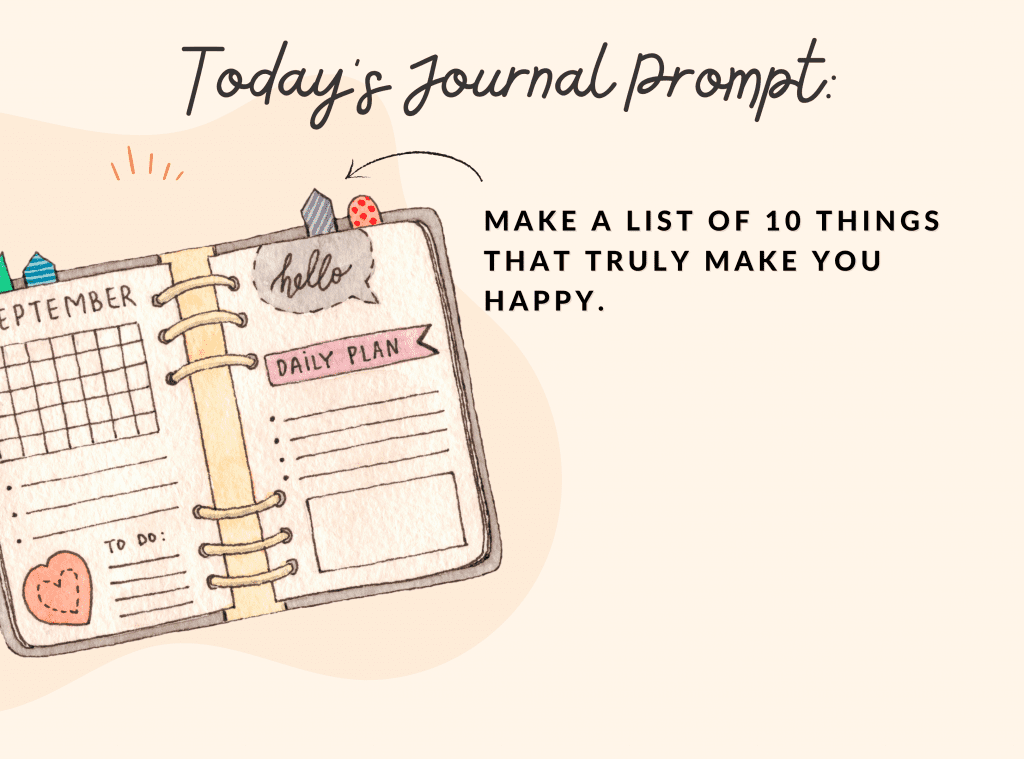 Set aside about 10–15 minutes and make a list of things that genuinely make you happy. These can be simple daily self care ideas, things you already love doing, or activities you haven’t made time for lately. You can also include things you’re curious about but haven’t tried yet.
